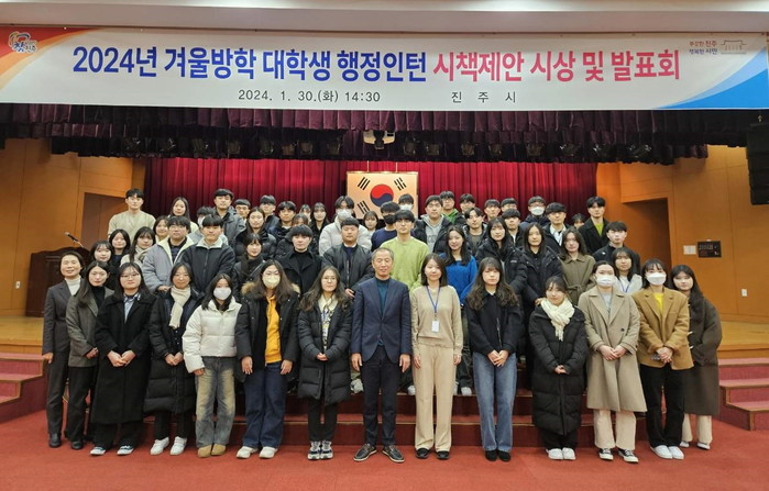 [프레스뉴스] 정호일 기자= 진주시는 30일 시청 시민홀에서 2024년 겨울방학 행정인턴사업에 참여한 학생 60명을 대상으로 실시한 ‘대학생 행정인턴 우수시책 제안자 시상식 및 발표회’를 개최했다.