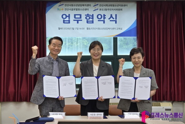 [프레스뉴스] 장현준 기자= 안산시(시장 이민근) 청소년상담복지센터는 지난 17일 본오2동 주민자치회 및 안산시 글로벌청소년센터와 위기청소년 발굴 및 청소년 안전망을 강화하기 위한 업무협약을 체결했다고 18일 밝혔다.