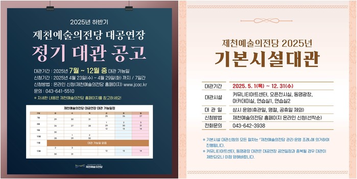 한편, 대관 일정 및 대관료 등 상세한 내용은 제천예술의전당 홈페이지(www.jcac.kr) 또는 (☎043-642-3938)로 문의하면 된다.