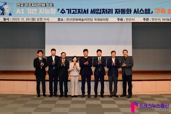 | ▲ 이민근 안산시장이 지난 20일 안산문화예술의전당 국제회의장에서 열린 AI 수기 고지서 세입 처리 자동화 시스템 구축 설명회에서 금동명 농협은행 공공금융부문 부행장 및 임직원, 관계공무원 등 참석자들과 기념촬영을 하고 있다.(사진=안산시) |