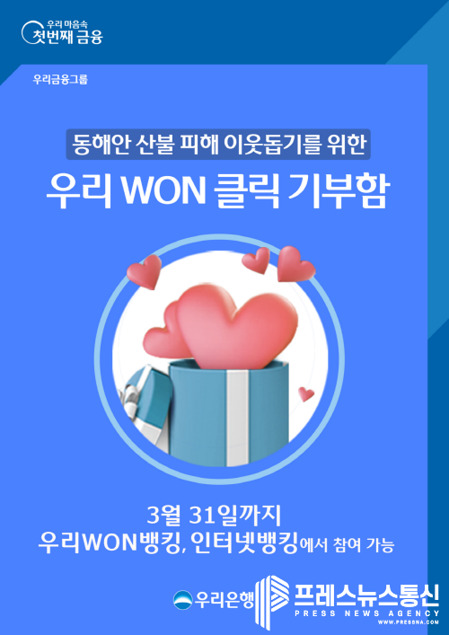 [프레스뉴스] 김대일 기자= 우리금융지주의 자회사 우리은행(은행장 권광석)은 동해안 대형 산불로 피해를 입은 이재민을 돕기 위해‘우리 WON 클릭 기부함’을 이번 달 31일까지 처음으로 운영한다고 10일 밝혔다.