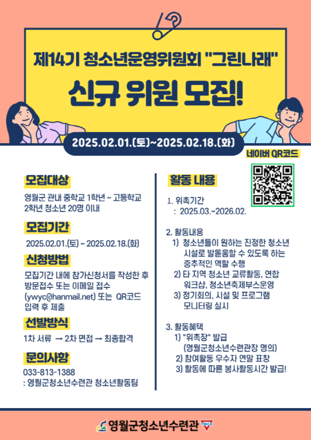 모집 관련 자세한 내용은 홈페이지(www.ywyc.kr) 내 공지사항 혹은 영월군청소년수련관 청소년활동팀(☎033-813-1388)으로 문의하면 된다.