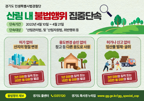 | ▲ 경기도 특사경, 산림 내 불법 훼손 행위 집중 단속 그래픽자료(사진=경기도) |