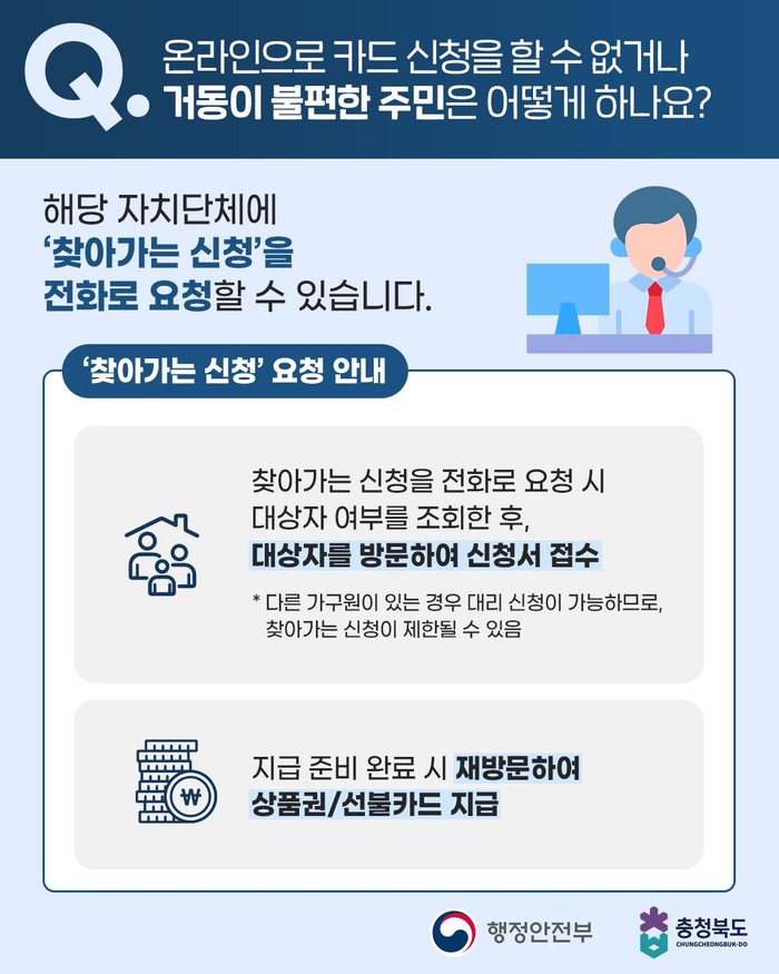민생회복 소비쿠폰 ‘찾아가는 신청’과 관련한 기타 사항은 각 주소지 읍면동 행정복지센터 또는 제천시 민생회복 소비쿠폰 전용 콜센터(☎043-641-5311~4)로 문의하면 된다.