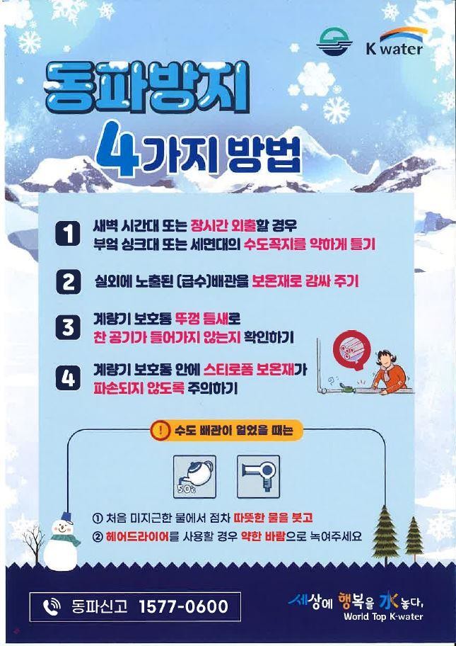 또한, 상수도 동파예방 홍보를 위한 리플릿을 제작해 11월부터 상수도요금 고지서와 함께 각 가정에 직접 배부할 계획이다.