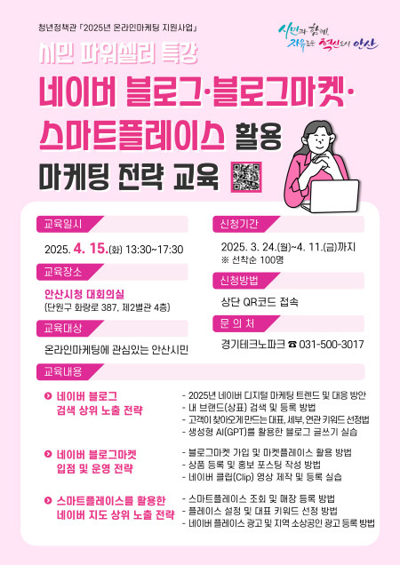 4월 15일 안산시청 대회의실에서 열리는 이번 교육에서는 온라인 쇼핑과 마케팅의 핵심 플랫폼인 네이버를 기반으로 블로그, 블로그마켓, 스마트플레이스를 활용한 마케팅 전략을 소개한다.