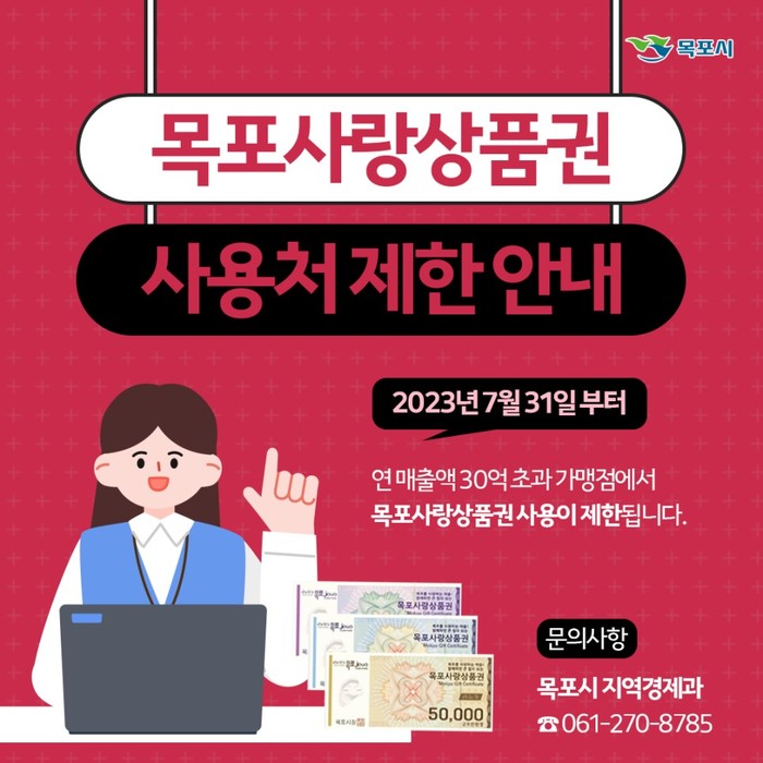 다만, 연매출액 30억 초과 가맹점에서는 농어민공익수당, 고향사랑기부제 답례품 등 할인 혜택이 없는 정책발행 목포사랑상품권은 현행대로 사용 가능하다.