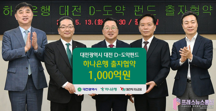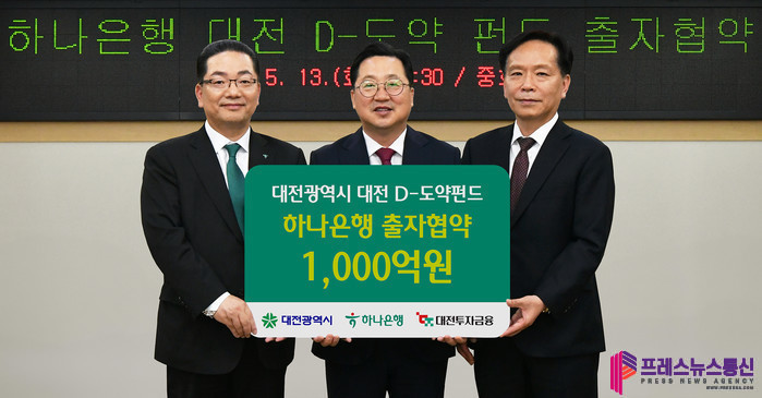 [프레스뉴스] 류현주 기자= 하나은행(은행장 이호성)은 지난 13일 오후 대전시청에서 대전광역시(시장 이장우), 대전투자금융(대표이사 송원강)과 함께 지역 스타트업 혁신 성장 지원 및 벤처투자 생태계 활성화를 위해 「대전 D-도약펀드」에 1천억원을 출자하는 협약을 체결했다고 밝혔다.