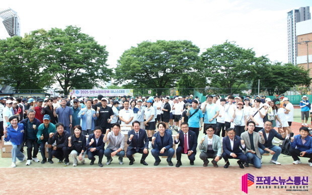 ▲지난 14일 안양시협회장배 테니스대회에서 최대호 이사장을 비롯한 테니스 관계자들이 기념촬영을 하고 있다.(사진=안양시) |