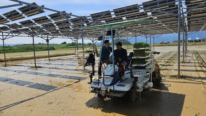 | ▲영암군 영농형 태양광 실증 논 벼이양작업/영암군 제공 |