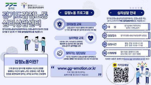 교육 및 상담을 희망하는 도내 감정노동자나 감정노동자 고용 사업주는 ‘경기도 감정노동 심리상담 센터 홈페이지’ 또는 전화로 문의하면 된다.