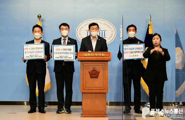 ▲ 윤화섭 안산시장이 2021년 6월 10일 국회 소통관에서 고영인·김남국·김철민(왼쪽부터) 국회의원과 함께 GTX-C노선 안산 연장을 촉구하는 기자회견을 하고 있다.(사진=경기도) |