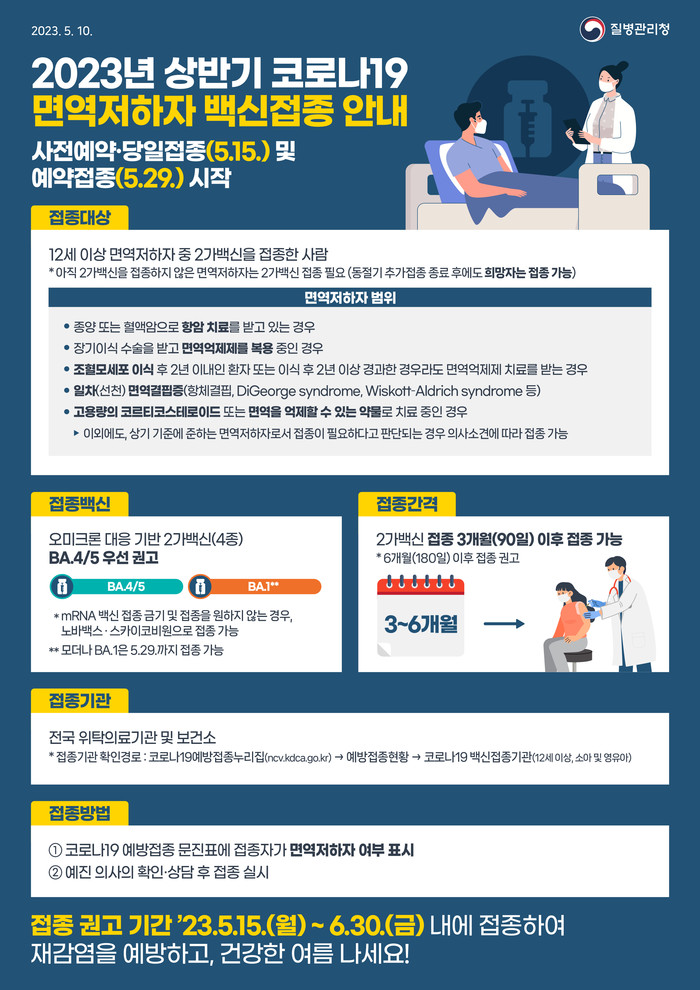 질병관리청의 ‘2023년 상반기 코로나19 고위험군 접종계획’에 따라 면역저하자 등 고위험군에 대한 사전예약 및 당일 접종을 진행중이다.