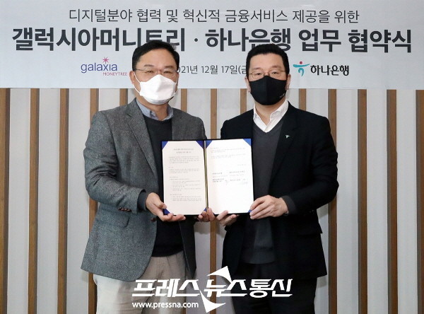 [프레스뉴스] 강보선 기자= 하나은행(은행장 박성호)은 핀테크 전문기업 갤럭시아머니트리(대표이사 신동훈)와 『혁신금융서비스 제공을 위한 업무협약』을 체결했다고 밝혔다.