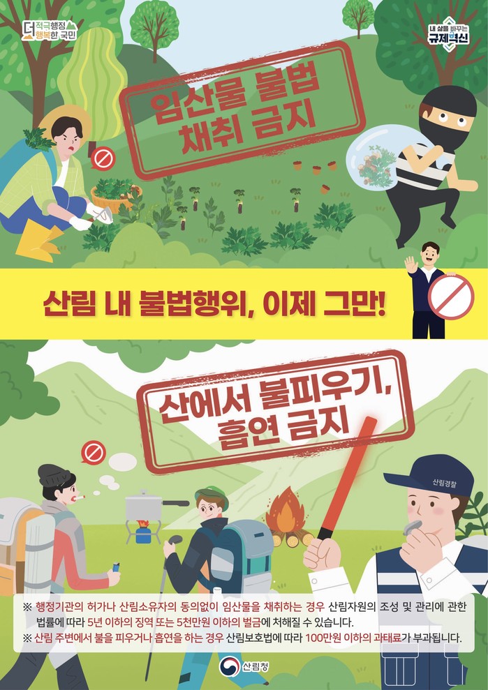 위법행위 적발 시 ‘산림보호법’과 ‘산림자원법’에 따라 과태료와 벌금 등을 엄중 부과할 방침이다. 산주 동의 없이 임산물 채취 시 5년 이하의 징역 또는 5천만 원 이하의 벌금, 입산통제구역 무단 입산 시 10만 원 이하의 과태료, 불법 소각 시 50만 원 이하의 과태료가 부과된다.