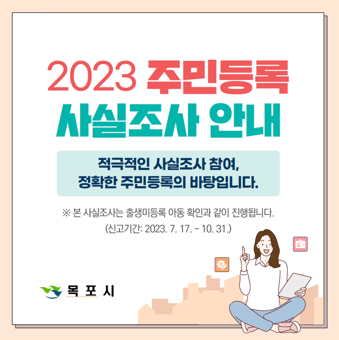 [전남=프레스뉴스] 이광남 기자= 전남 목포시는 전 시민을 대상으로 오는 11월 10일까지 2023년 주민등록 사실조사를 실시한다고 밝혔다.