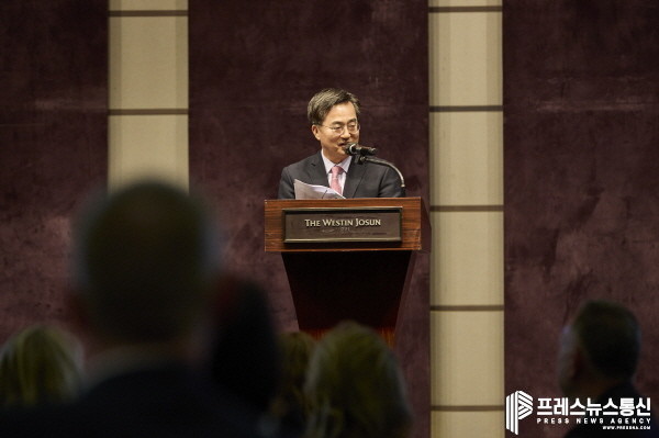 | ▲ 30일 서울 중구 웨스틴조선 호텔(서울)에서 열린 주한 영국대사 초청 크리스마스 만찬 리셉션에서 김동연 경기도지사가 축사를 하고 있다.(사진=경기도) |