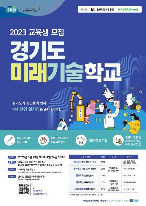 ‘경기도미래기술학교’는 4차 산업혁명, 탄소중립 등 변화하는 산업수요에 적합한 인공지능(AI), 빅데이터, 지능형 공장(스마트팩토리) 등 기업 맞춤형 미래기술 분야 전문 인재 육성을 목표로 하고 있다. 올해도 삼성SDS, KT, 네이버 클라우드 등 대기업과 연계해 실무자 특강, 현장실습, 자격증 취득 과정 등을 운영한다.