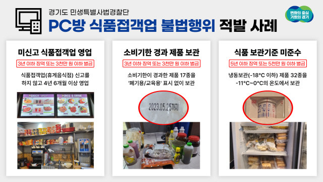 | ▲ 경기도 민생특별사법경찰단, PC방 식품접객업 불법행위 적발 사례 그래픽자료(사진=경기도) |