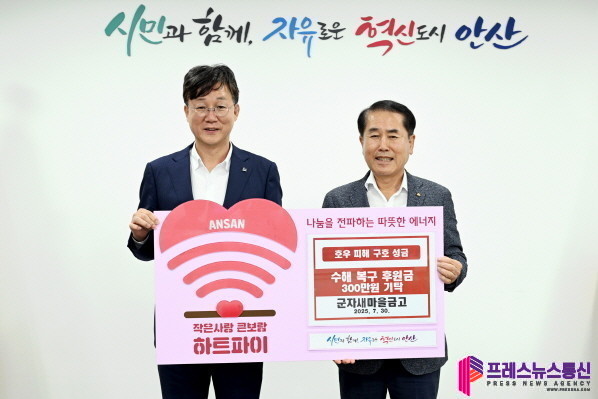 [프레스뉴스] 장현준 기자= 안산시(시장 이민근)는 지난 30일 군자새마을금고(이사장 이상기)로부터 수해 지역 복구를 위한 성금 300만 원을 기탁받았다고 31일 밝혔다.
