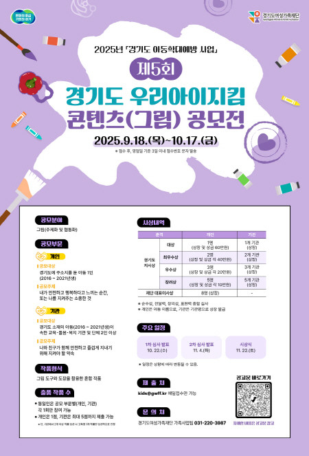 심사는 외부 전문가가 순수성, 전달력, 창의성, 표현력 등을 기준으로 진행하며, 총 30작품을 선정해 시상한다. ▲경기도지사상은 개인 1명(상금 60만 원)과 기관 1곳 ▲최우수상은 개인 2명(각 40만 원)과 기관 2곳 ▲우수상은 개인 3명(각 20만 원)과 기관 3곳 ▲장려상은 개인 5명(각 10만 원)과 기관 5곳 ▲재단 대표이사상은 개인 8명에게 수여할 예정이다. 수상작은 도내 전시와 함께 교육·홍보 자료로 활용되며, 카드뉴스와 영상 등 2차 콘텐츠로 제작해 아동권리 존중과 학대 예방 홍보에 쓸 계획이다.