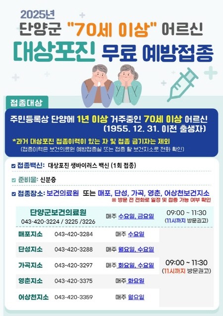 접종 대상은 단양군에 1년 이상 주민등록을 두고 거주 중인 70세 이상(1955년 12월 31일 이전 출생자)으로, 기존에 대상포진 예방접종을 받지 않은 군민이다.