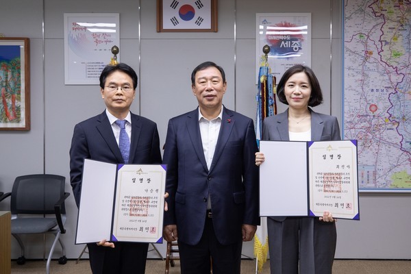 ▲지난 9월 26일 최민호 세종시장이 나승권 법무법인 ‘이인’ 대표변호사와 최린아 법률사무소 ‘혜결’ 대표변호사를 세종시자치경찰위원회 위원장으로 임명했다.(사진=세종시) |