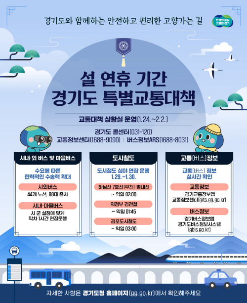 도는 먼저 시외버스의 경우 5개 권역에 44개 노선 88대를 증차하고 운행횟수를 138회 증회한다. 시내·마을버스는 필요시 시군 자체 실정에 맞춰 1시간 연장 운행 등 탄력적으로 운영한다. 도시철도는 하남선과 7호선(부천 구간), 별내선은 1월 29일부터 30일까지 2일간 익일 오전 2시까지, 의정부 경전철은 익일 오전 1시 45분까지, 김포도시철도는 익일 오전 3시까지 심야 연장 운행한다.