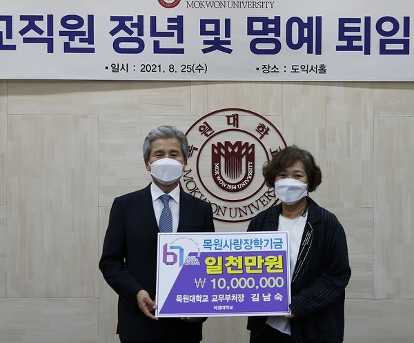 [프레스뉴스] 강동기 기자= 오는 31일 정년퇴임을 앞둔 김남숙 목원대 교무부처장은 장학기금 1000만원을 대학측에 전달했다.