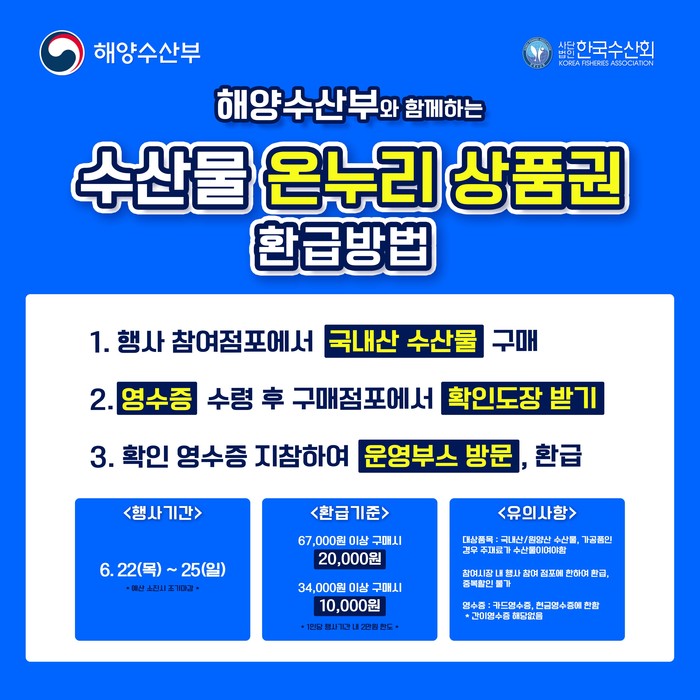 행사는 오는 22일부터 25일까지 진행되며, 수산물 판매점포에서 국내산 수산물을 구입하면 시장 내 환급 부스에서 영수증을 확인하고 당일 구매금액의 최대 30%를(최대 2만원) 온누리상품권으로 환급해주는 방식으로 진행된다.