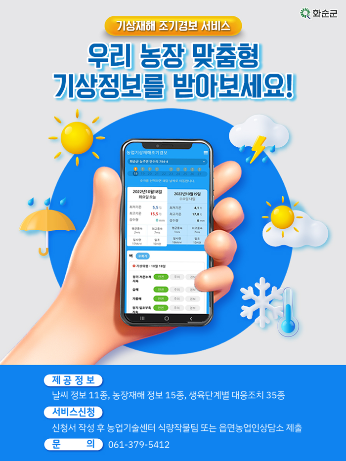 [전남=프레스뉴스] 박정철 기자= 화순군(군수 구복규)은 농장단위로 기상알림을 받을 수 있는 기상재해 조기경보 서비스 가입 홍보에 적극 나섰다.