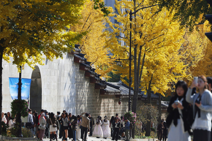 | ▲9일 오후 서울 종로구 효자로에서 외국인 관광객과 시민들이 노랗게 물든 은행나무 옆을 지나고 있./사진=뉴스1 |