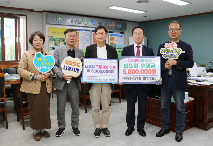 [전남=프레스뉴스] 강래성 기자= 전라남도 나주시(시장 윤병태)는 나주광주요양병원(병원장 이동언)이 고향사랑기부금 최고 한도 금액인 500만 원과 이웃돕기 성금 500만 원을 기탁했다고 13일 밝혔다.