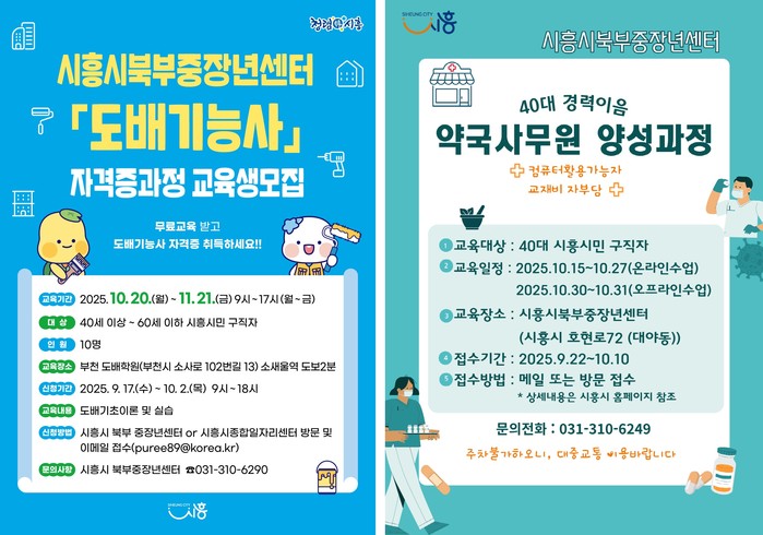 특히 10월에는 도배기능사 자격증 과정과 약국 사무원 양성 과정을 개설해 참여자를 모집하며, 참여 신청은 9월 17일부터 10월 2일까지 시흥시북부중장년센터(시흥시 호현로 72)에 방문하거나 전자우편을 통해서도 가능하다. 교육별 장소 및 기간이 다르므로 교육 관련 자세한 사항은 시흥시청 누리집의 고시공고 게시판에서 확인하면 된다.