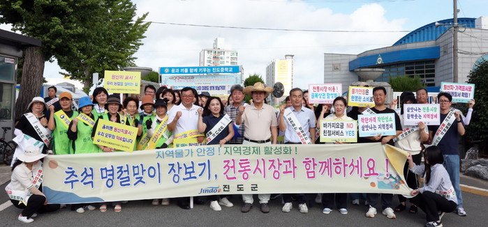 ▲진도군은 12일 진도읍 조금시장에서 추석 명절을 맞이하여 물가안정 분위기 조성과 전통시장 활성화를 위한 캠페인을 했다.(사진제공=진도군) |