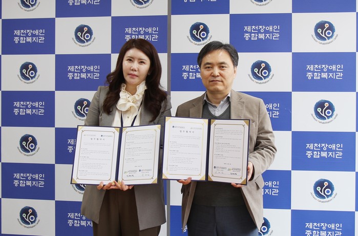 | ▲제천장애인종합복지관 육아종합지원센터 업무협약(왼쪽부터 민혜영 센터장, 오재원 관장) |