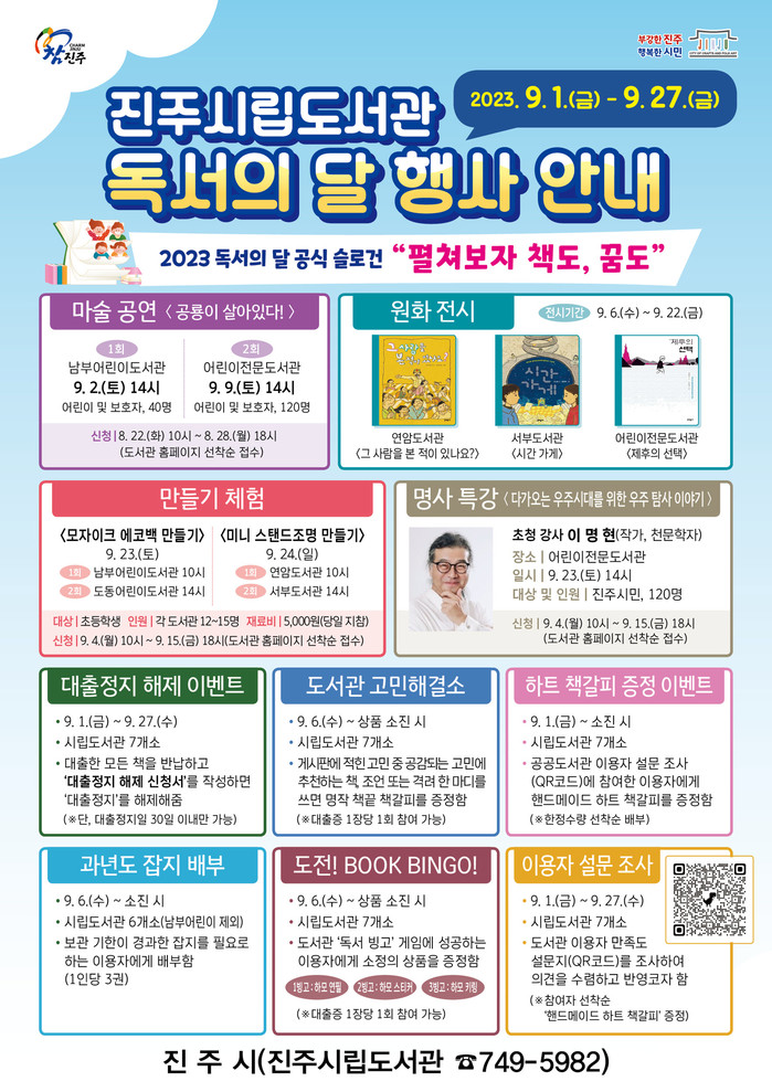 [프레스뉴스] 정호일 기자= 진주시립도서관은 9월 독서의 달을 맞아 ‘펼쳐보자 책도, 꿈도’라는 슬로건 아래 다양한 독서의 달 프로그램을 운영한다.