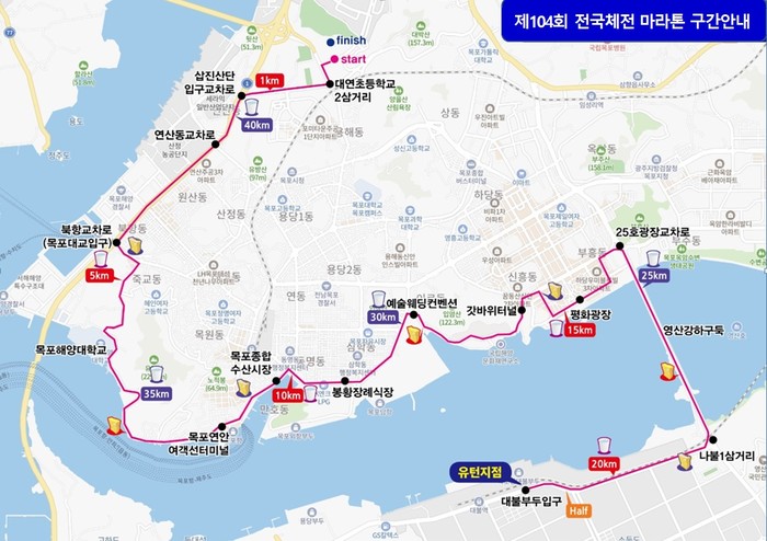 주요 구간은 오는 15일 42.195km 풀코스 마라톤은 종합경기장 ~ 삽진산단입구 ~ 목포연안여객선터미널 ~ 봉황장례식장 ~ 평화광장 ~ 영산강하구둑 ~ 대불부두 입구가 통제된다.