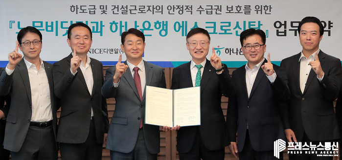 [프레스뉴스] 김대일 기자= 하나은행(은행장 이승열)은 나이스디앤알(NICE D&Rㆍ대표이사 박정우)과 건설근로자의 임금체불 피해 방지 및 영세 건설사업자의 공사대금 결제환경 개선을 위한 업무협약을 체결했다고 밝혔다.