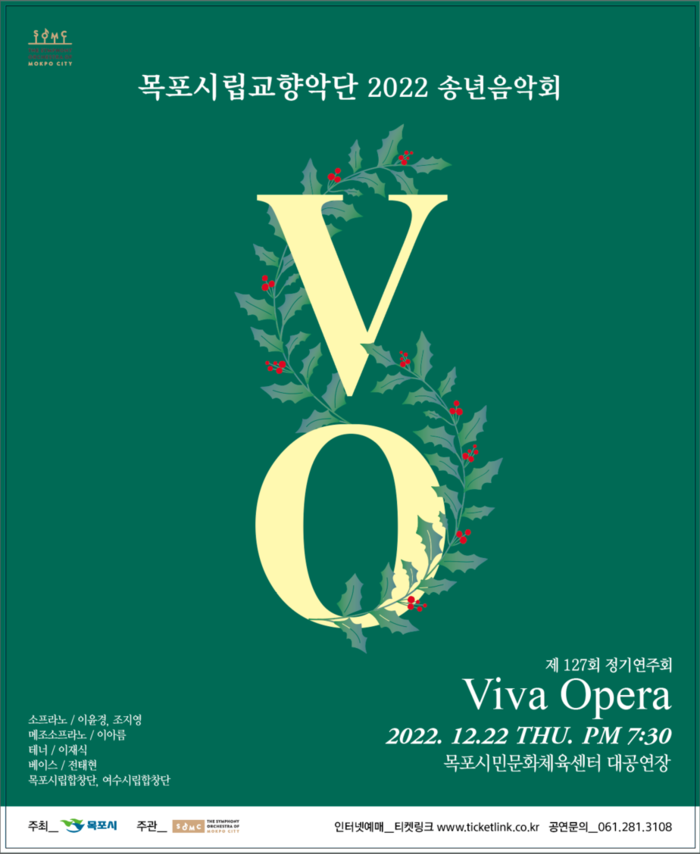 목포시립교향악단의 송년음악회인 ‘Viva Opera’가 오는 22일 시민문화체육센터에서 열린다. 정헌 상임지휘자의 지휘로 진행되는 이번 음악회는 바그너의 오페라 ‘뉘른베르크의 명가수’ 서곡으로 시작하며 ‘토스카’, ‘카발레리아 루스티카나’, ‘주디타’, ‘사랑의 묘약’ 등 오랫동안 사랑받아 온 유명 오페라들의 아리아를 국내 정상급 성악가인 소프라노 이윤경, 소프라노 조지영, 메조소프라노 이아름, 테너 이재식, 베이스 전태현 등이 노래한다.