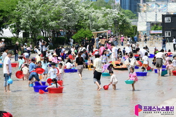 | ▲지난 4일 개막한 안산국제거리극축제 현장인 안산문화광장 물의광장에서 임시 호수를 만들어 어린이들이 더운 날씨에 물놀이를 즐기고 있다.(사진=안산시) |