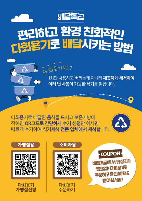 다회용기 사업은 배달특급 가맹점 음식 포장에 스테인리스 재질 용기(用器)를 사용하는 것이다. 소비자는 다회용기와 1회 용품 가운데 원하는 용기를 선택할 수 있다. 배달 음식의 가장 큰 문제점으로 지적받는 1회용품 폐기물 문제를 효율적으로 해결할 수 있는 것이 장점으로 꼽힌다.