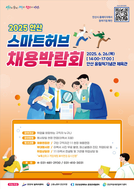 [프레스뉴스] 장현준 기자= 안산시(시장 이민근)는 오는 26일 안산 올림픽기념관 체육관에서 ‘2025 안산 스마트허브 채용박람회’를 개최한다고 12일 밝혔다.