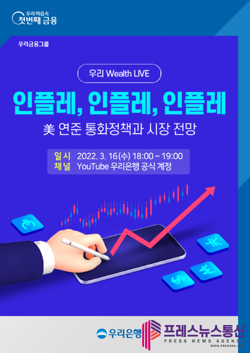 [프레스뉴스] 김대일 기자= 우리금융지주의 자회사 우리은행(은행장 권광석)은 3월 16일 오후 6시에 유튜브를 통해 언택트 자산관리 세미나‘우리 Wealth LIVE’를 개최한다고 14일 밝혔다.