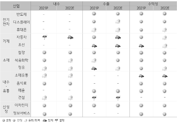 상대적으로 호조를 이어갈 것으로 보이는 화학·정유, 철강 등 소재산업군은 제품가격 상승의 수혜가 사라지겠으나 전방 수요 개선으로 인해 양호한 성장세를 유지할 것으로 전망했다. 다만 안혜영 연구원은 “섬유,의류 등 전방 수요가 늘어나겠으나 ‘22년 하반기부터 중국 등 아시아 신증설 물량이 공급될 예정되어 있어 공급 과잉 우려가 나올 가능성이 높다”라고 언급했다.