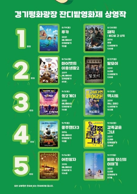8월 19일 미국 아카데미 시상식 장편 애니메이션상 후보작 ‘루카’를 시작으로, 20일에는 코믹 액션 영화 ‘해적: 바다로 간 산적’, 26일에는 애니메이션 ‘마이펫의 이중생활 2’, 27일에는 일제강점기, 평범한 사람들이 ‘우리말 큰사전’을 편찬한 이야기를 그린 ‘말모이’를 상영할 예정이다.