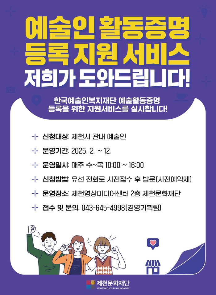 문화재단은 문학, 미술, 사진, 음악 등 11개 분야별 예술활동증명을 신청하지 못한 지역 예술인을 대상으로 신청 대행 행정 지원 서비스를 지원한다.