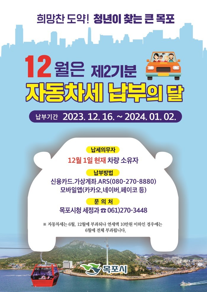 | ▲목포시가 2023년도 제2기분 자동차세 5만493건 81억원을 부과·고지했다.(사진제공=목포시) |