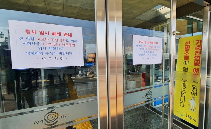 [전남=프레스뉴스] 강래성 기자= 전라남도 나주시가 29일 청내 직원 코로나19 감염에 따른 추가 확산 차단을 위해 이날 하루 청사 본청과 별관 건물을 임시 폐쇄한다.