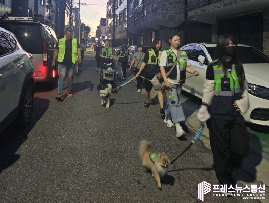 이날 참여한 반려견 순찰대 13팀은 대형견과 소형견 2개 조로 나눠 1시간 30분 동안 사동 인근 주택가 치안 취약지역 3km 구간을 순찰했다. 특히 인적이 드문 골목길과 유동 인구가 많은 상가 지역을 점검, 범죄 예방을 위한 활동을 벌였다.